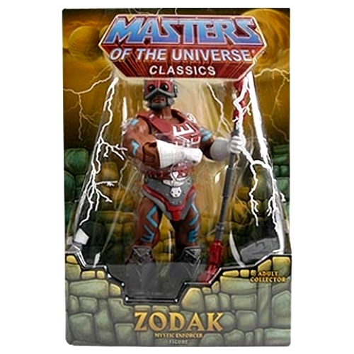 Descripción: Un antiguo y poderoso guerrero del Consejo de Ancianos, Kar-tor estudió la enseñanza y las técnicas místicas de la lucha de los Guerreros Cósmicos y sabe como instantáneamente identificar la debilidad de un oponente. Luego que su mentor, el Zodac original, dejó Eternia para llevar a cabo el trato de los Ancianos del Consejo con Trolla, Kar-tor tomó su lugar en el Consejo y ayudó a llevarlos a la batalla contra los Snake Men, eventualmente capturando a King Hssss en el vacío con el poder de su báculo. Aunque prefiere una vida solitaria de meditación en las Montañas Místicas, cuando es llamado para la batalla, Zodak ataca a sus enemigos usando todo el poder bajo su mando. La figura mide casi 17 cms de alto, es por demás articulada y está pintada con una calidad realmente para destacar. Trae su clásica armadura color rojo junto con su báculo cósmico. Este Zodak está hecho en base al Zodak del año 2002 que tiene guantes blancos, la piel oscura y diferentes símbolos tatuados en el cuerpo de color celeste que brillan en la oscuridad.
