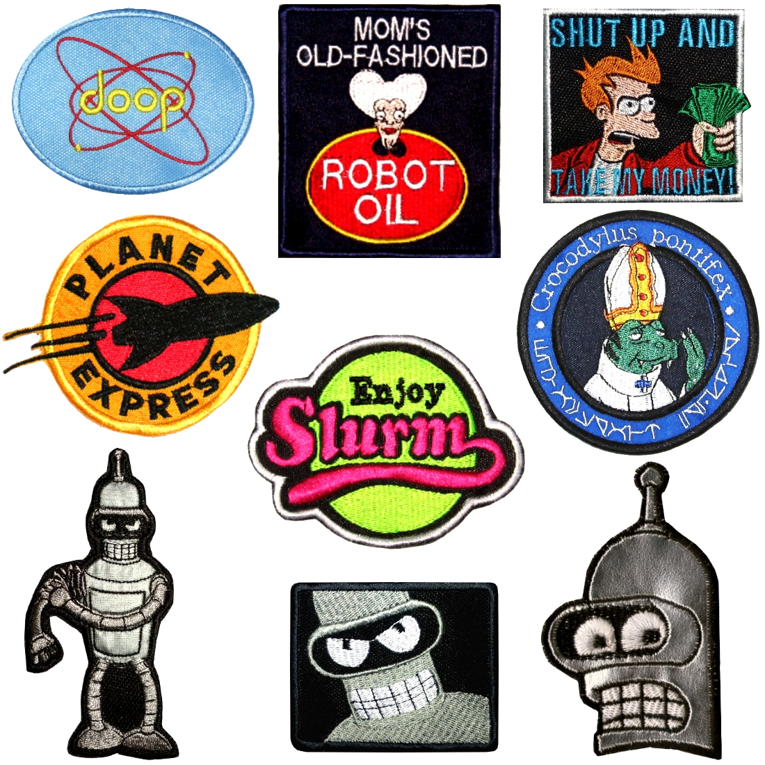 | Parches Futurama | Bender, Cabeza Bender, Cara de Bender, Enjoy Slurm, Escudo Crocodylus Pontifex, Etiqueta Aceite para Robot de Mamá, Logo Doop, Logo Planet Express, Shut up and take my money |