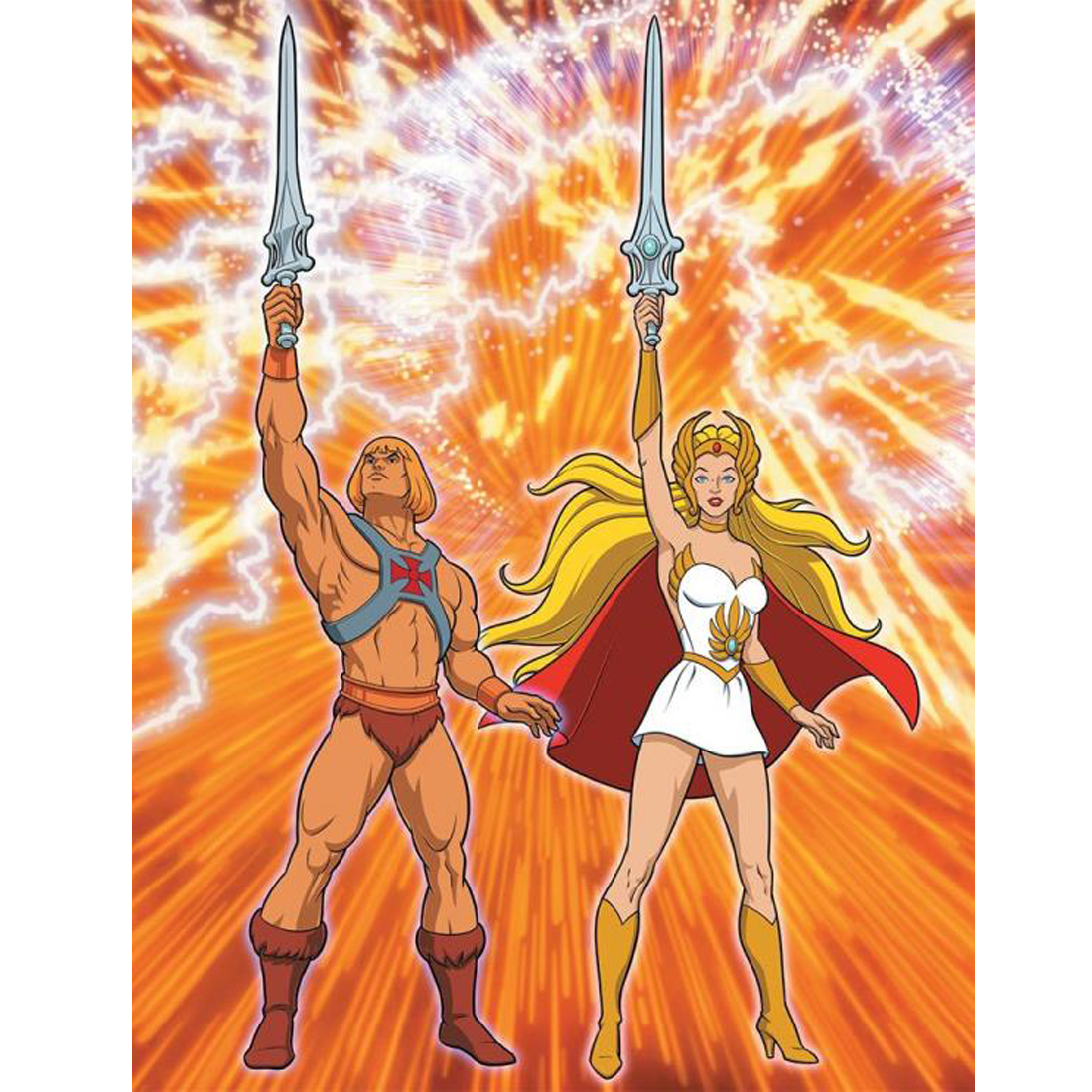¡Y para el elemento de coronación, está envuelto con una sobrecubierta de holofoil con He-Man y She-Ra en su famosa escena de transformación! El holofoil hace que la magia cobre vida mientras mueves el libro en tus manos, y saldrá de cualquier estante de coleccionista. La parte posterior de la sobrecubierta presenta a los dos seres más malvados de Eternia y Etheria: Skeletor y Hordak, ¡listos para atacar!