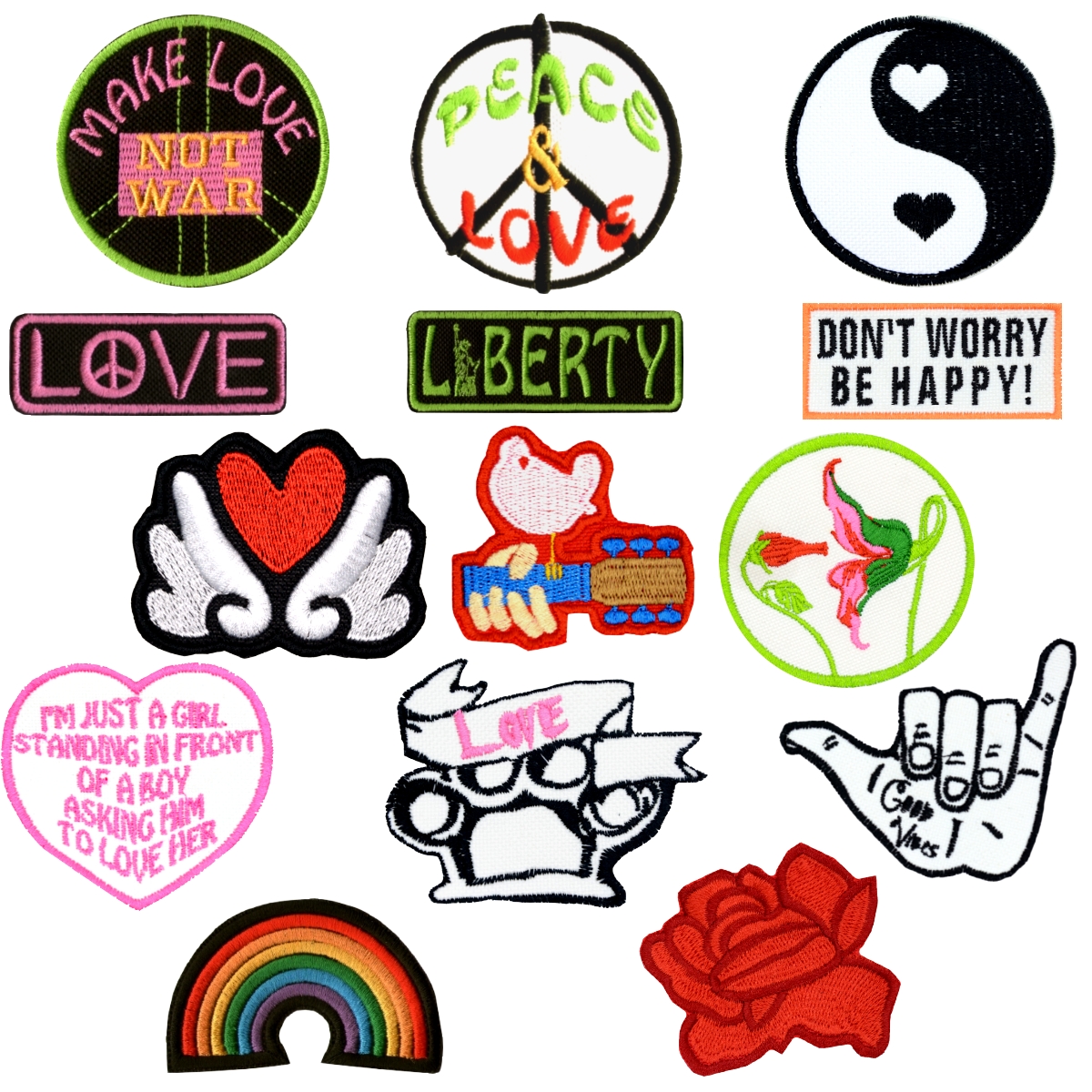 | Parches Amor y Paz | Amor entre Flores, Arco Iris, Buena Onda, Corazón con Alas, Don't Worry Be Happy!, Guitarra con Paloma, Hagamos Amor, No Guerra, Liberty, Love, Mano con Amor, Paz y Amor, Rosa, Solo soy una Mujer Pidiendo Amor, Yin & Yang de Amor |