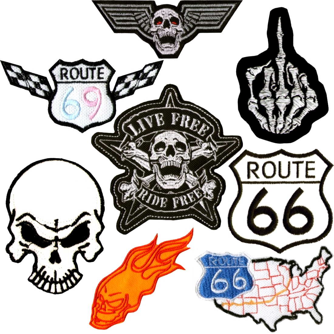Calavera, Calavera con Alas, Calavera en Llamas, Fuck You Esqueleto, Live Free Ride Free, Mapa Ruta 66, Ruta 66, Ruta 69